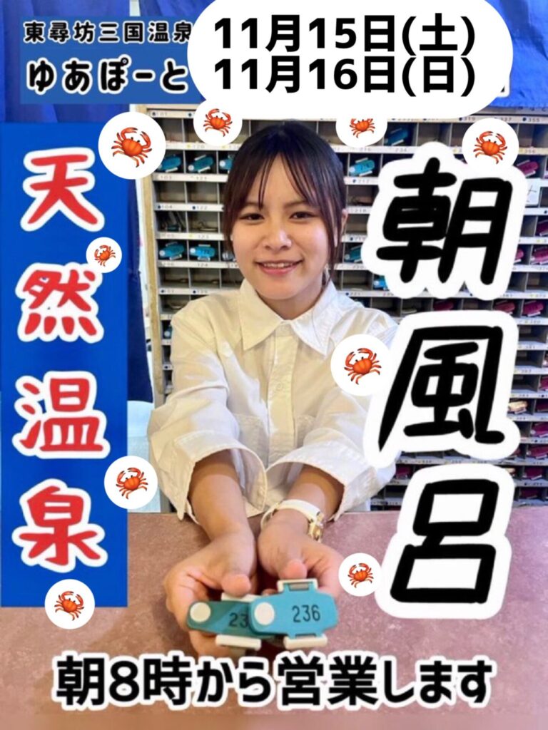ホーム お知らせ・イベント 11/15(土)~16(日)『朝風呂』開催 朝8時から営業します! 11/15(土)~16(日)『朝風呂』開催 朝8時から営業します! いよいよ11/15(土)〜11/16(日) ゆあぽ〜との隣り 三国サンセットビーチ駐車場で 『三国湊2025かに祭り』開催です! ゆあぽ〜とも協力しています 。 ゆあぽ〜とは『朝風呂』を開催! 朝8時から営業します。 関連するお知らせ・イベント サンセットラウンジのベンチ 8/24(土)~25(日) ゆあぽ~と名物 恐竜風呂 年末年始営業のお知らせ 7/12~7/13『レモン風呂』開催