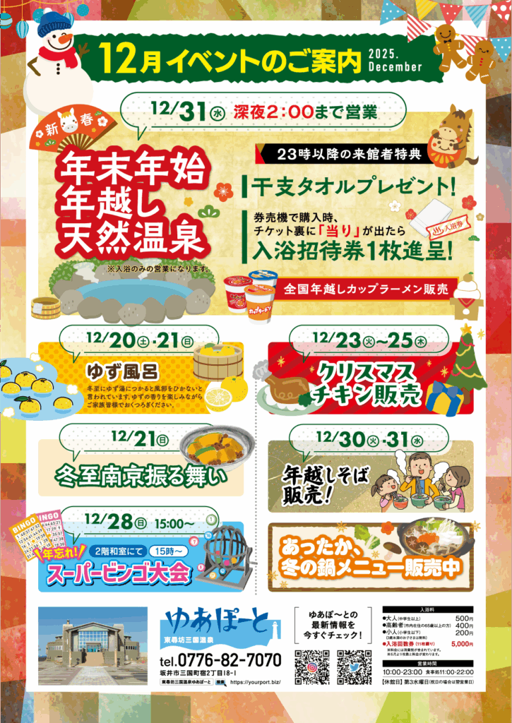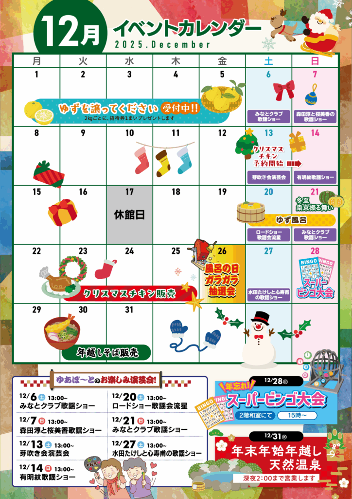 ホーム お知らせ・イベント 12月イベントカレンダー 12月イベントカレンダー 12月イベントカレンダーができました。 年末年始も休まず営業します! 関連するお知らせ・イベント 回数券料金改定 並びに 有効期限設定のお知らせ 9/23まで『越のゆグループお客様満足度アンケート』実施中! 3月イベントカレンダー 11/23(日)15:00『 スーパビンゴ大会』開催!
