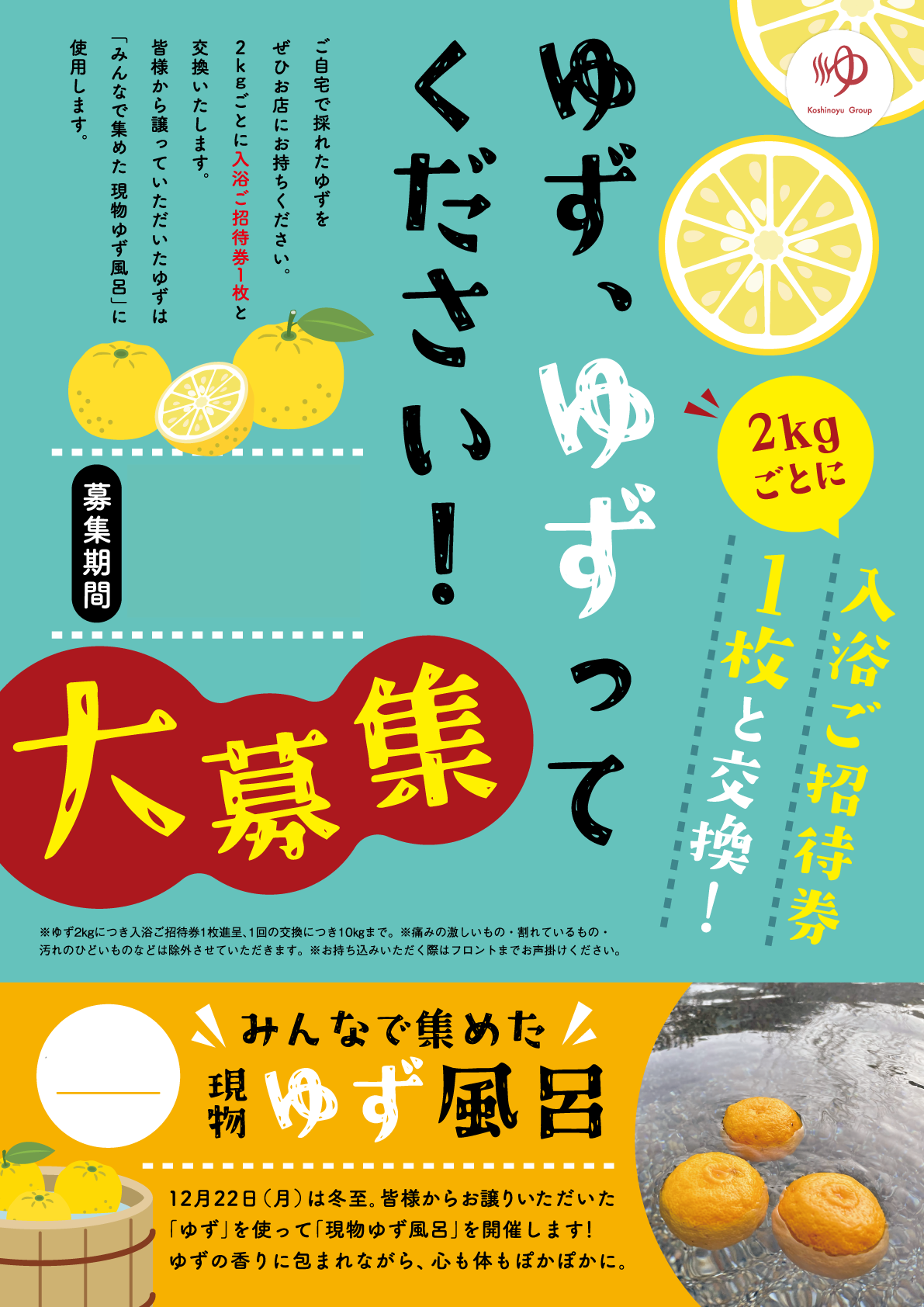 ホーム お知らせ・イベント ゆずを譲ってください🍊 ゆずを譲ってください🍊 ご家庭で採れたゆずをぜひ譲って下さい! 2kgで入浴招待券1枚と交換させて頂きます✨ 関連するお知らせ・イベント 回数券料金改定 並びに 有効期限設定のお知らせ 9/23まで『越のゆグループお客様満足度アンケート』実施中! 3月イベントカレンダー 11/23(日)15:00『 スーパビンゴ大会』開催!
