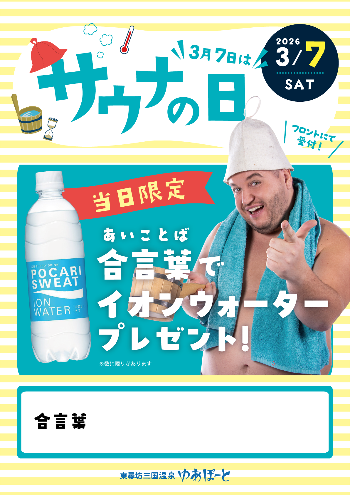 ホーム お知らせ・イベント 3/7(土)は『サウナの日』合言葉でイオンウォータープレゼント! 3/7(土)は『サウナの日』合言葉でイオンウォータープレゼント! 3/7(土)は『サウナの日』合言葉でイオンウォータープレゼント! 合言葉は当日浴場に掲示します! 関連するお知らせ・イベント 5月イベントカレンダー 福井県立大学生の方限定!越のゆグループ学割クーポン 4月イベントカレンダー 11/23(日)・11/24(祝)『りんご風呂』開催!