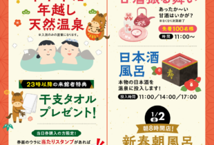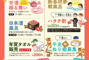ホーム お知らせ・イベント 1月イベントカレンダー 1月イベントカレンダーができました。 年始はゆあぽ~とでほっ... 年末年始イベントのご案内 ゆあぽ~とは年末年始休まず営業します。 年末年始はゆあぽ~と... 1/30(火)~31(水) 『年越しそば販売』 1/30(火)~31(水) 『年越しそば販売』 対象メニュー... 12/31(水) 『年末年始年越し天然温泉』開催! ゆあぽ~とは年末年始も休まず営業いたします! 12/31(水... 12/28(日)15:00 ビンゴ大会開催! 12/28(日)15:00から今年最後のビンゴ大会開催! 牛... 毎月26日は『 風呂の日ガラガラ抽選会』 毎月26日は『 風呂の日ガラガラ抽選会』を開催! お得な入浴... テイクアウト クリスマスチキンご予約受付中! ゆあぽ〜と特製テイクアウト クリスマスチキンご予約受付中! ... 12/21(日)朝11:00 先着100名様に冬至南京振るまい 12/21(日)朝11:00から 先着100名様に冬至南京振... 12/20(土)~22日(月)『ゆず風呂』 ゆずを譲ってください🍊 ご家庭で採れたゆずをぜひ譲って下さい! 2kgで入浴招待券1... 1 / 1312345...10...»最後 »